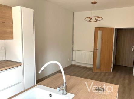 Byt prošel kompletní rekonstrukcí a jeho dispozici tvoří vstupní chodba s vestavěnou skříní, hlavní obytná místnost s francouzským oknem, kuchyňským koutem s moderní kuchyňskou linkou vč. vestavěných spotřebičů, dále menší samostatná ložnice a koupelna se sprchovým koutem a toaletou. Vytápění bytu je ústřední centrálním plynovým kotlem v budově. Cena pronájmu je uvedena bez měsíčních záloh, které činí cca 4 300 Kč (teplo, teplá/studená voda, provozní výdaje domu). Elektřina na vlastní účet nájemce.